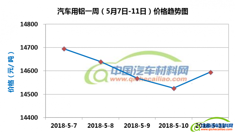 汽车用铝本周内价格变化如下:5月7日-10日,价格下跌,跌幅为169元/吨;10-11日价格小幅度回升。汽车用铝本周均价为14605元/吨,较4月份均价上涨0.39%。