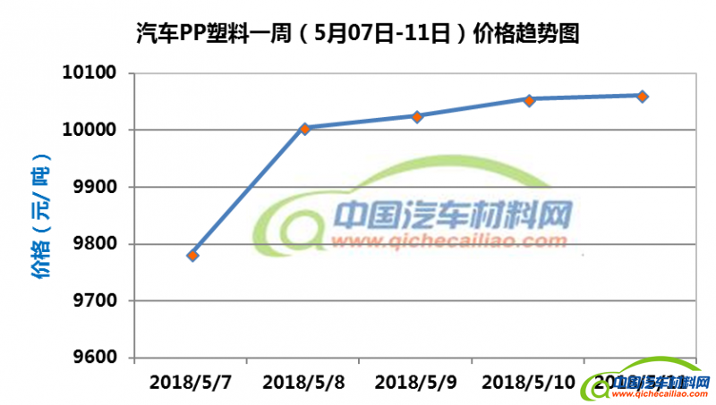 车用PP塑料本周价格持续上涨,一周内涨幅为136.28元/吨。车用PP塑料本周均价为10014.51元/吨,较4月份均价上涨2.96%。