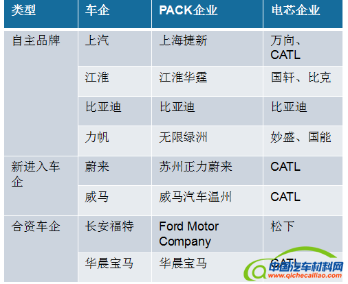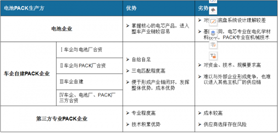 目前乘用车动力电池PACK市场参与企业主要有三种类型,车企、电池企业、专业第三方PACK生产企业,三种类型企业在PACK环节市场上各有优劣。