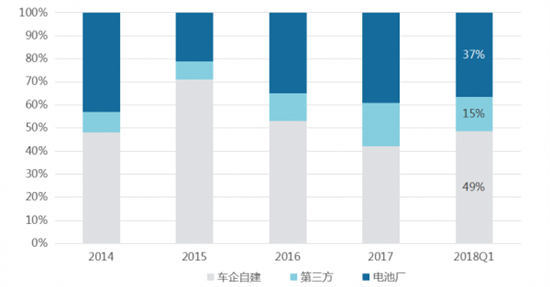 2014-2018Q1新能源乘用车动力电池PACK市场占比(%)