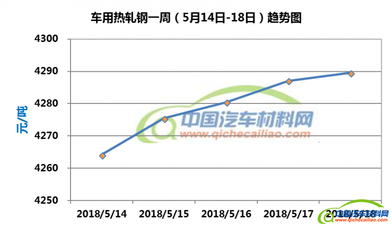 热轧钢本周内价格呈持续上涨趋势,一周内涨幅为25.42元/吨。车用热轧钢本周平均价格为4279.3元/吨,较上周上涨0.70%,较4月份均价上涨3.40%。