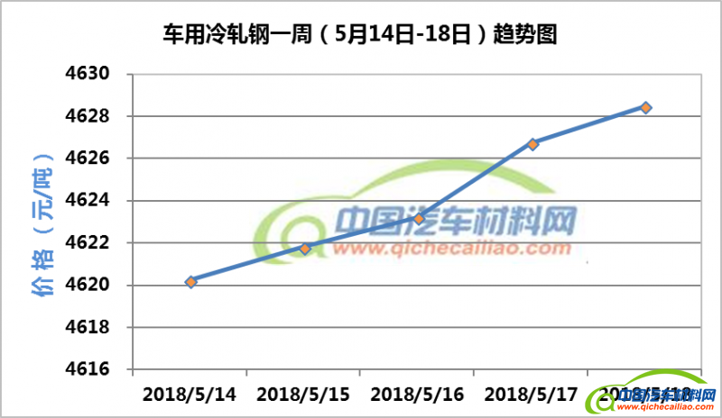 冷轧钢本周价格持续小幅上涨,一周内涨幅为6.67元/吨。车用冷轧钢本周平均价格为4625.07元/吨,较上周上涨0.20%,较4月份均价上涨1.24%。
