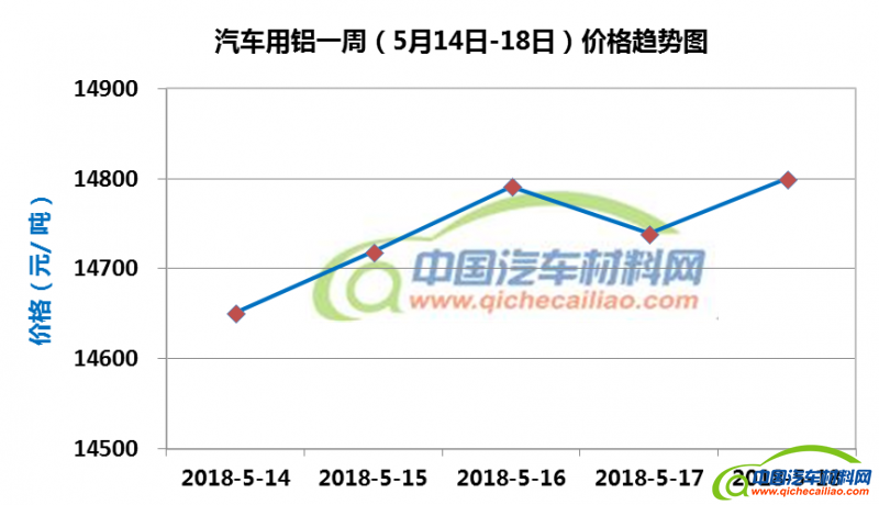 汽车用铝本周内价格变化如下:5月14日-16日,价格上涨,涨幅为140元/吨;16-17日价格下跌,17-18日又有所回升。汽车用铝本周均价为14740元/吨,较上周上涨0.92%,较4月份均价上涨1.32%。