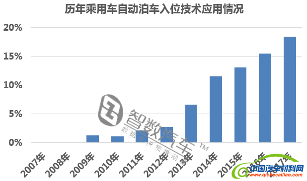 自动泊车入位技术在2009年开始就有了1.27%的应用比例,2009年开始逐渐得到推广,应用比例逐年增加。2017年上市的乘用车中,自动泊车入位技术应用比例达到了18.43%。