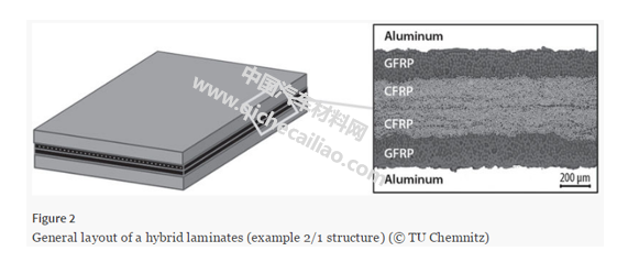 研究者们先尝试采用多种纤维增强复合材料和薄铝板制作了一种独特的混合层压材料,如图2所示。纤维增强复合材料基体保证了足够的强度和刚性,减轻了部件重量,并提升了耐疲劳性能。而铝合金外壳则提供了优异的抗冲击性和延展性。