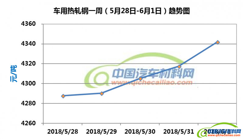 热轧钢本周内价格呈持续上涨趋势,一周内涨幅为54.17元/吨,本周五价格涨至4342.08元/吨。车用热轧钢本周平均价格为4308.7元/吨,较上周上涨0.63%,较5月份均价上涨0.78%。