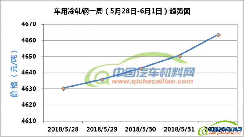 冷轧钢本周价格呈持续上涨趋势,一周内涨幅为33.14元/吨,本周五价格涨至4663.67元/吨。车用冷轧钢本周平均价格为4648.28元/吨,较上周上涨0.45%,较5月份均价上涨0.50%。