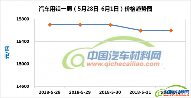 汽车用镁本周价格稳中有降,一周内有100元/吨的小幅下跌。汽车用镁本周均价为15660元/吨,较上周下跌0.76%,较5月份均价上涨0.60%。