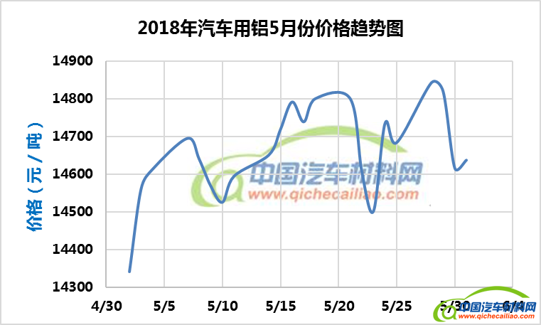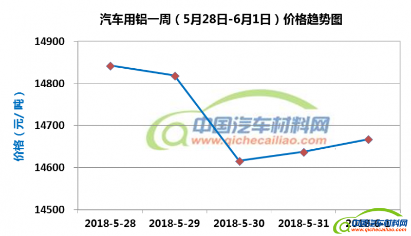 汽车用铝本周内价格变化如下:5月28日-30日,价格下跌,跌幅为226元/吨;5月30日-6月1日价格略有回升。汽车用铝本周均价为14717元/吨,较上周上涨0.35%,较5月份均价上涨0.40%。