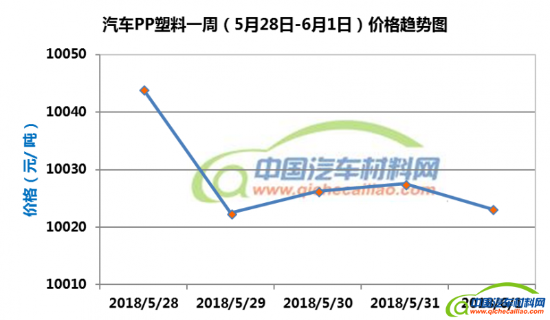 车用PP塑料本周价格变化如下:5月28日-29,价格下跌,跌幅为21.54元/吨;5月29-31日,价格有小幅度回升;5月31日-6月1日,价格又有小幅下跌。车用PP塑料本周均价为10028.69元/吨,较上周上涨0.009%,较5月份均价上涨0.03%。