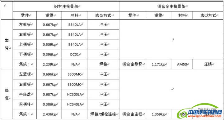 镁合金靠背相比钢材靠背减重1.068Kg,减重比47.7%,镁合金座框相比钢材靠背减重1.077Kg,减重比44.2%。