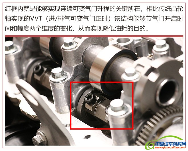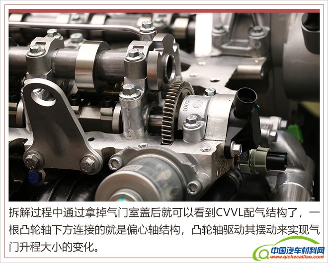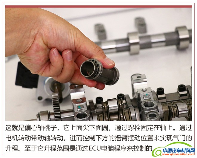 目前市面上应用了该技术的主机厂主要有三家,分别为宝马(Valvetronic )、日产(VVEL)和本田(i-VETC/VETC)。虽然每家的命名有所不同,但是结构原理都是一样的。简单来说就是在凸轮轴上方加入一根偏心轴,利用偏心轴上的凸轮位置改变来实现气门升程的变化。长城这台发动机是其自主研发成果,也是国内首个发动机应用该技术的汽车品牌。