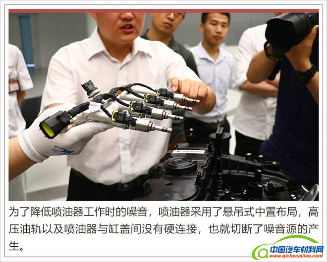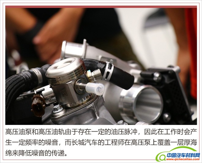 涡轮增压直喷发动机由于使用了高压喷油泵和管道设计,因此会发出非常有频率的“哒哒哒”声音,或许开过大众汽车的人会对这个哒哒哒的声音更有体会。那么长城汽车针对这一噪音源是如何处理的呢?长城汽车发动机工程师在高压油泵上增加了一个海绵隔音降噪的保护套,对噪音进行二次过滤。