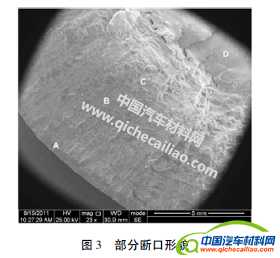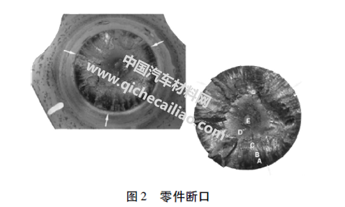 断口位于零件上的过渡角处,此处本身就有结构上的应力集中。两匹配断口低倍形貌如图2所示,此断面分为4部分:边缘为3块光滑部分,中心为1块大三角形部分,与零件构造有关。边缘3部分为先开裂部分,中心三角形为最后断裂区,裂源位于边缘,为了描述方便按断面先后断裂次序分为A、B、C、D及E区。