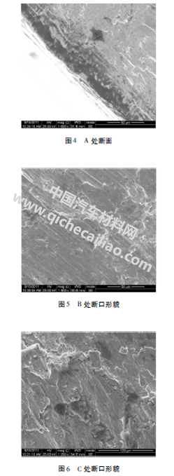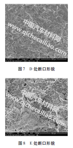 部分断口低倍形貌如图3所示,A区断面形貌如图4所示,断面有条纹及表面有裂纹;B、C区断面形貌如图5、图6所示,仅可见因受力而形成的纹路,显微结构则被磨光;D区断面形貌如图7所示,可见断面呈方向性韧窝;E区断面形貌如图8所示呈等轴韧窝。