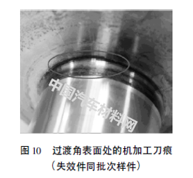 断口分析显示,起裂位置在过渡角表面。对该过渡角处的表面进行观察,发现机加工刀痕较深,且未磨光(如图9、图10所示),容易成为疲劳裂源。