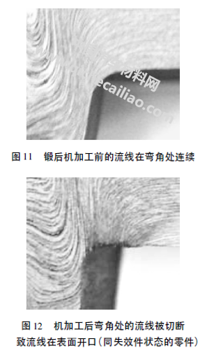 (3)锻造流线在过渡角近表面处不连续,有流线开口,导致疲劳裂纹起始于表面并沿着流线方向扩展。