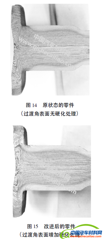 供应商按照上述改进方案重新制造了一批零件。改进前后2种状态零件的表面硬化层和锻造流线样式如图14、图15所示。最后,按改进方案制造的零件通过了设计要求的耐久性试验,保证了该车型的后期开发进度。
