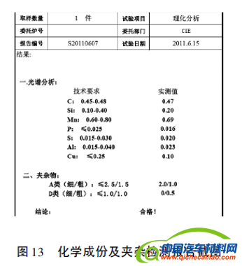 对失效件进行化学成份及夹杂检测,各指标参数符合规范要求(材料属中碳钢),结论为合格,如图13所示。