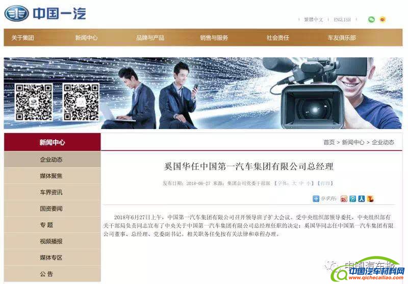 6月27日上午,中国一汽通过其官网发布公告称,中国一汽于今天召开领导班子扩大会议,中央组织部有关干部局负责同志在会上宣布了中央关于中国第一汽车集团有限公司总经理任职的决定:奚国华任中国第一汽车集团有限公司董事、总经理、党委副书记。相关职务任免按有关法律和章程办理。