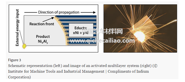该系统的反应速度可达到100 m/s,其最高的燃烧温度只能持续几毫秒。这意味着连接部件表面受到的热能较小,对于部分金属材料来说,难以熔化。因此,在连接过程中,连接件的表面需要用用焊接材料涂覆,该焊接材料在放热反应期间熔化形成牢固的接合。该方法适用于金属、塑料、陶瓷复合材料等的连接。目前已成功用于半导体、车身结构件、电子电器件等部位。然而,该系统的应用成本较高。并且,由于材料的脆性,该系统仅适用于平面或略微弯曲的连接。