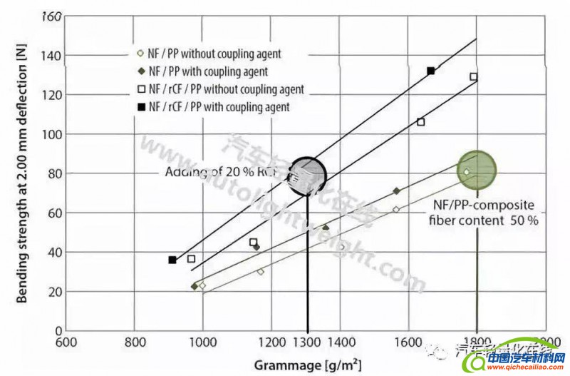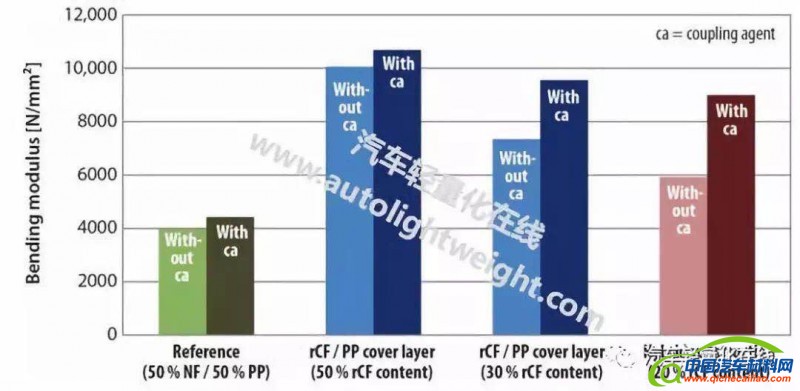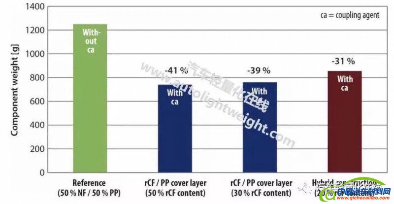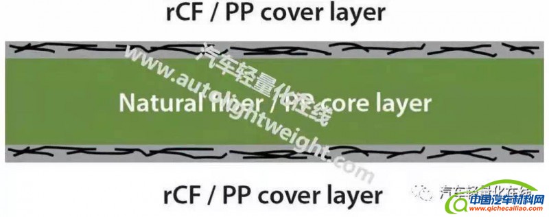 通常这种材料的克数约在1600-2000g/m 2范围。考虑到汽车开发中轻量化的需求,减少半成品的重量是必须的。单单采用目前使用的天然纤维复合材料,且不降低机械值(刚度,冲击强度),是无法实现这一点的。具有再循环碳纤维(rCF,recycled carbon fibres)的混合复合材料,保持相同或更好的机械性能的同时能够显着降低组件重量,成为天然纤维复合材料的一种替代方案。