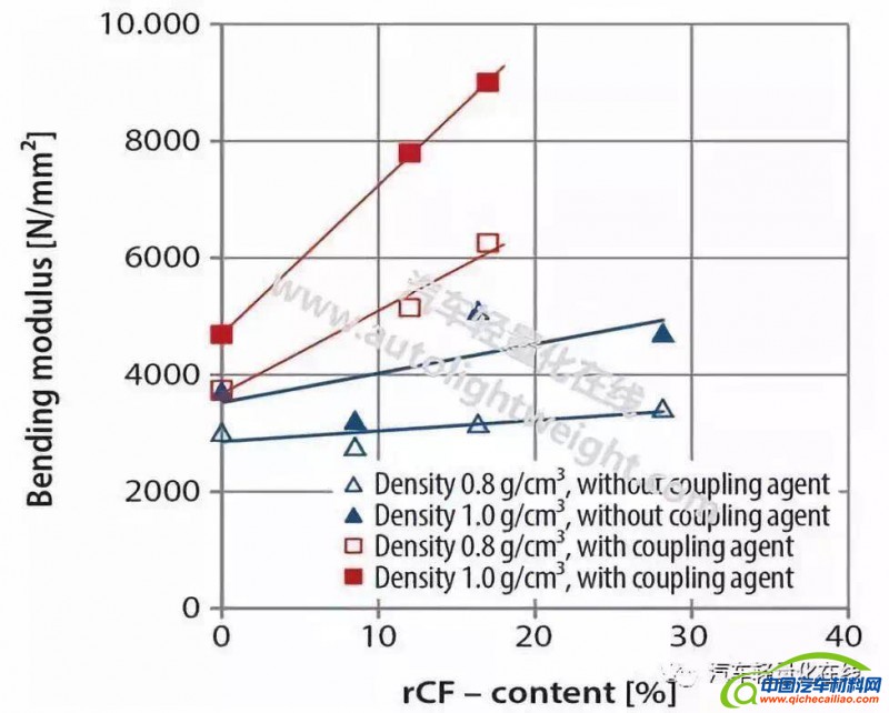 图3和图4显示了具有不同rCF含量的混合非织造织物的NF/rCF/PP化合物的弯曲性质。没有优化的纤维基质粘合,随着碳纤维含量的增加,弯曲强度和弯曲模量仅有略微增加。更高压实(1.0g/cm3与0.8g/cm3相比)的复合材料具有更好的机械性能。改性PP纤维(包括马来酸酐)的使用引起机械性能的显着增加,因此碳纤维含量的增加也显示出对强度和模量的更明显的增加效果。