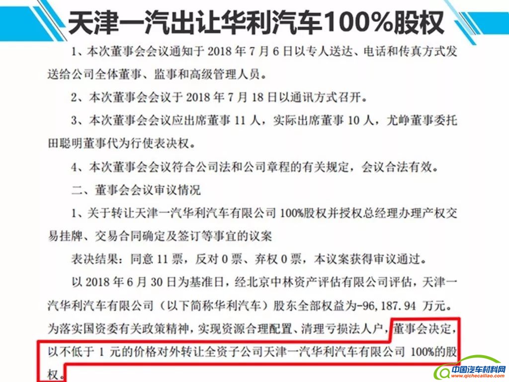 7月19日,一汽夏利发布公告称,董事会决定以不低于1元的价格对外转让全资子公司天津一汽华利汽车有限公司100%股权。公告显示,经评估华利汽车股东全部权益为-96187.94万元。