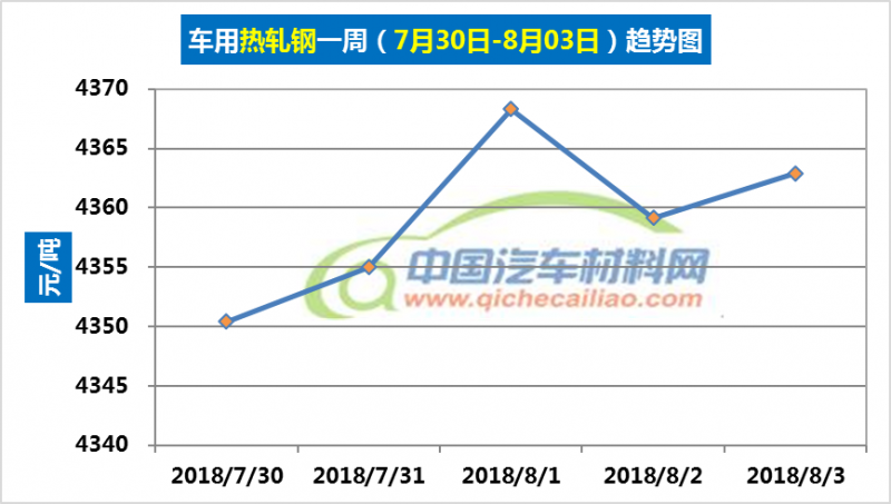 热轧钢本周内价格变化如下:7月30日-8月1日,价格上涨,涨幅为17.92元/吨;8月1日-2日,价格下跌,跌幅为9.17元/吨;8月2日-3日,价格又有小幅回升。车用热轧钢本周平均价格为4359.2元/吨,较上周上涨0.96%,较7月份均价上涨1.08%。
