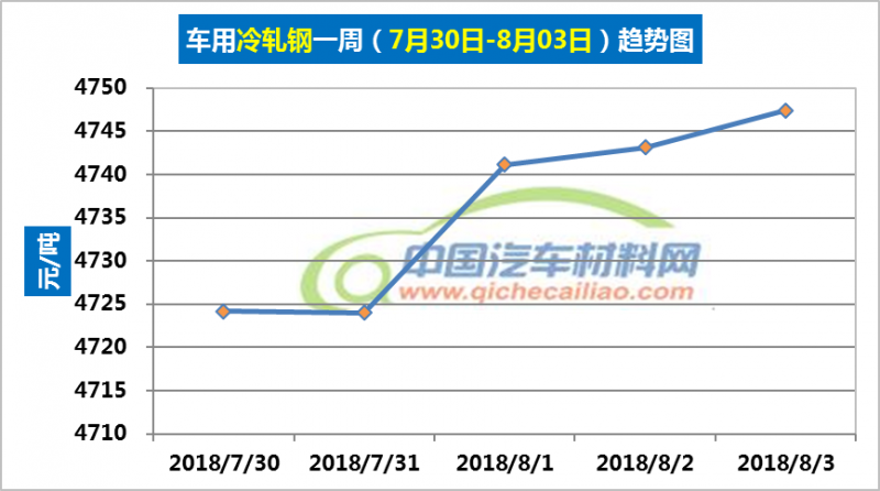 冷轧钢本周价格总体呈上涨趋势,一周内涨幅为23.22元/吨,本周五价格涨至4747.42元/吨。车用冷轧钢本周平均价格为4735.98元/吨,较上周上涨0.59%,较7月份均价上涨0.84%。