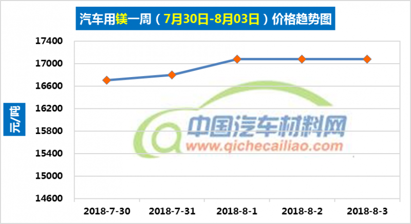 汽车用镁本周价格稳中有升,一周内涨幅为375元/吨。汽车用镁本周平均价格为16945元/吨,较上周上涨1.47%,较7月份均价上涨2.15%。