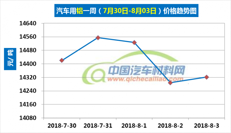 汽车用铝本周内价格变化如下:7月30日-31日,价格上涨,涨幅为135元/吨;7月31-8月2日价格下跌,跌幅为266元/吨;8月2-3日,价格再次小幅回升。汽车用铝本周均价为14422元/吨,较上周上涨1.21%,较7月份均价上涨2.21%。