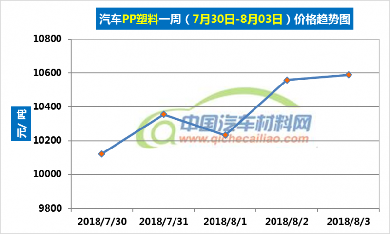 车用PP塑料本周价格总体呈上涨趋势,只7月31日-8月1日有小幅下跌。PP塑料本周价格涨幅为466元/吨。车用PP塑料本周均价为10370.98元/吨,较上周上涨0.92%,较7月份均价上涨2.65%。