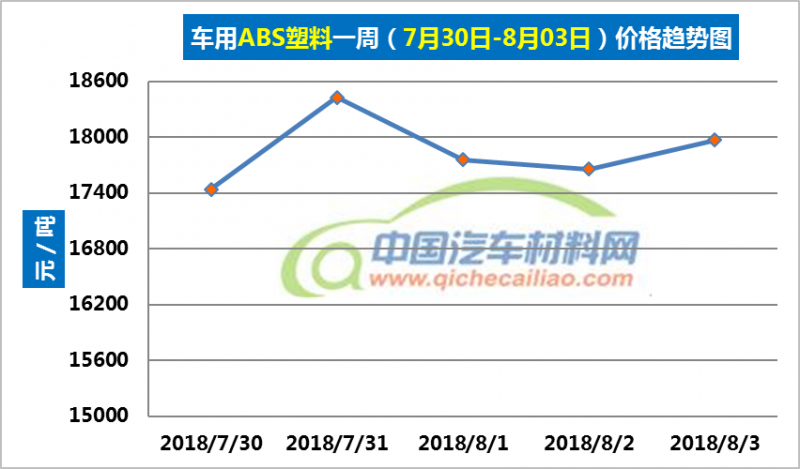 ABS塑料本周价格变化如下:7月30-31日,价格上涨,涨幅为987.23元/吨;7月31日-8月2日,价格下跌,跌幅为768.67元/吨;8月2-3日价格又有小幅回升。车用ABS塑料本周均价为17851.85元/吨,较上周上涨1.23%,较7月份均价上涨3.47%。