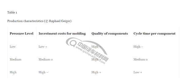 将纤维材料铺设在模具中,形成一定的形状;合模后通过压力注射树脂,浸渍纤维,再进行固化脱模。根据压力水平分为低压(LP-RTM)和高压(HP-RTM)两种类型。其中,压力大小对产品质量、应用成本、生产周期等均有影响,具体见下表1。