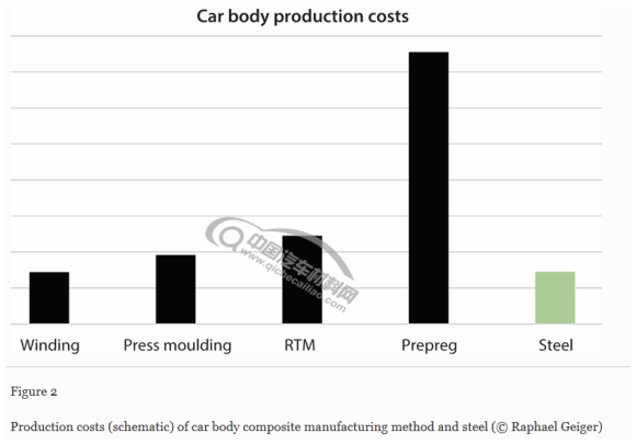 对于碳纤维车身件来说,缠绕成型无法满足要求,模压成型是较具成本效益的碳纤维复合材制造方法。综合来看,碳纤维复合材料车身的生产成本约是同类钢制车身的1.35倍。