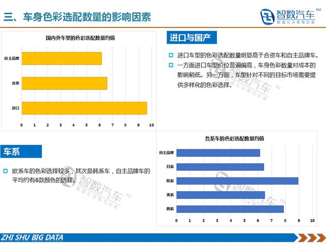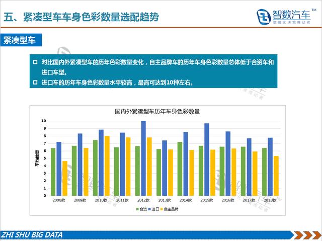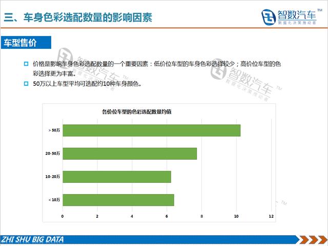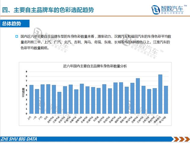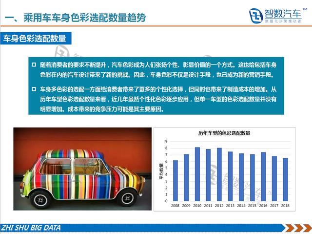 随着消费者的要求不断提升,汽车色彩成为人们张扬个性、彰显价值的一个方式。这也给包括车身色彩在内的汽车设计带来了新的挑战。因此,车身色彩不仅是设计手段,也已成为新的营销手段。车身多色彩的选配一方面给消费者带来了更多的个性化选择,但同时也带来了制造成本的增加。从历年车型色彩选配数量来看,近几年虽然个性化色彩逐步应用,但单一车型的色彩选配数量并没有明显增加。成本带来的竞争压力可能是期主要原因。