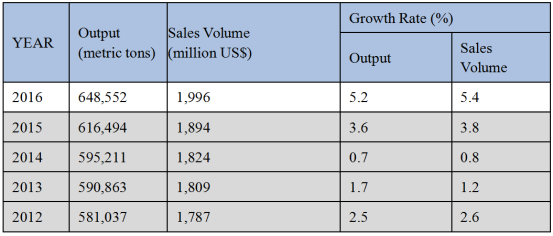 表2. 2012-2016年胶粘剂&密封剂产量、销售额及增长率