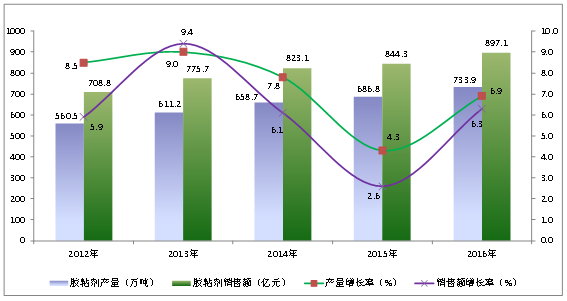 目前中国已成为世界胶粘剂生产和消费大国。无论是产量还是销售额,中国胶粘剂行业一直保持着增长的势头。 2016年胶粘剂和密封剂的产量、销售额分别为733.9万吨、897.1亿元,分别比前一年增长了6.9%和6.3%。