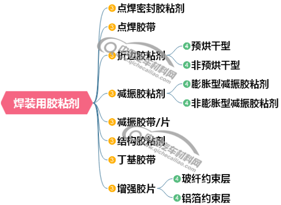 减振胶粘剂:有膨胀和非膨胀两种类型。其中膨胀型减振胶粘剂应用较多,主要用在车门内外板之间,车身覆盖件与加强筋之间。一般由合成橡胶或树脂添加发泡剂而成,经过固化膨胀,能将覆盖件与加强筋结合为一体,起到减振降噪的作用。