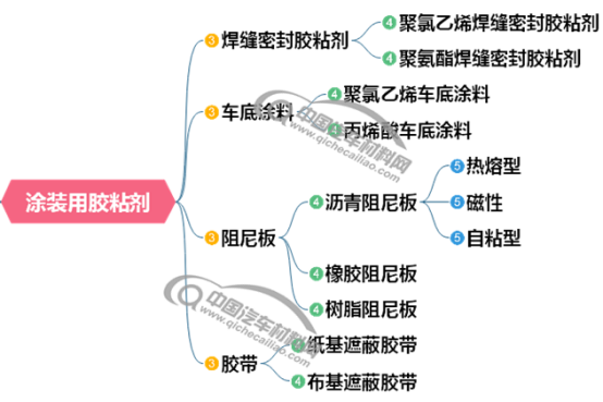 涂装工艺中胶粘剂用量相对较少,主要有焊缝密封、车底涂料。主要以PVC塑溶胶为基材成份,通过高压涂胶设备实施机械化涂布或喷涂。此外,还涉及阻尼板和胶带的应用。