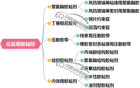 总装工艺主要涉及的胶粘剂有风挡玻璃同聚氨酯胶粘剂、阻尼胶片、压敏胶带、结构胶、内饰用胶粘剂等类型。