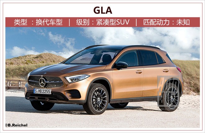 全新奔驰GLA或将运用类似全新A级的最新家族化设计理念。流畅的车身顶部配备行李架,并用熏黑材质进行装饰,看起来较为硬朗,同时突出其年轻化的产品定位。车头处,双层镀铬格栅中悬挂着大尺寸LOGO,底部保险杠立体感十足。动力上,现款在售车型搭载的是1.6T以及2.0T涡轮增压发动机,全新一代车型推出后有望继续由北京奔驰引入进行本土化生产。