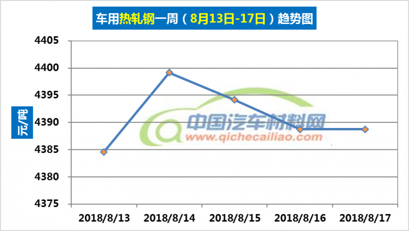 热轧钢本周内价格变化如下:8月13-14日,价格上涨,涨幅为14.58元/吨;8月14-17日,价格下跌,跌幅达10.42元/吨。车用热轧钢本周平均价格为4391.1元/吨,较上周上涨0.45%,较7月份均价上涨1.82%。