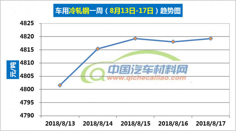 冷轧钢本周价格总体呈上涨趋势,一周内涨幅为17.69元/吨,本周五价格涨至4819.28元/吨。车用冷轧钢本周平均价格为4814.73元/吨,较上周上涨1.01%,较7月份均价上涨2.51%。