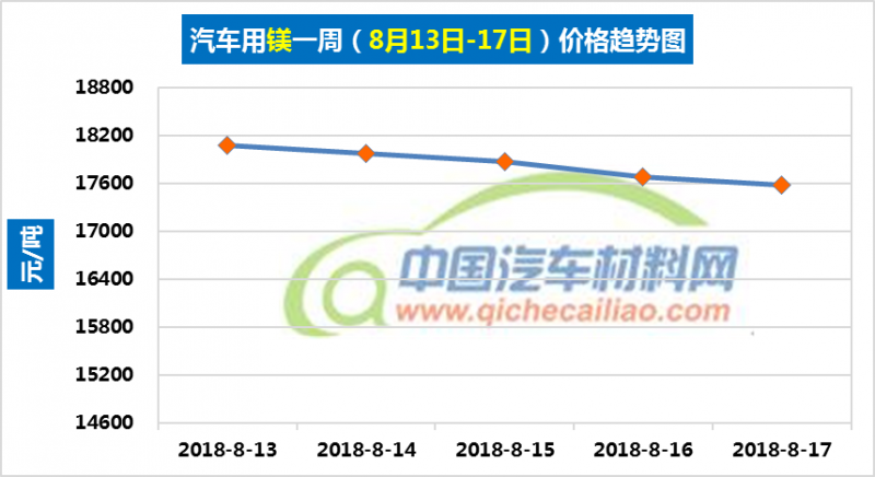 汽车用镁本周价格呈下跌趋势,一周内跌幅达500元/吨,本周五价格跌至17575元/吨。汽车用镁本周平均价格为17835元/吨,较上周上涨0.06%,较7月份均价上涨7.52%。