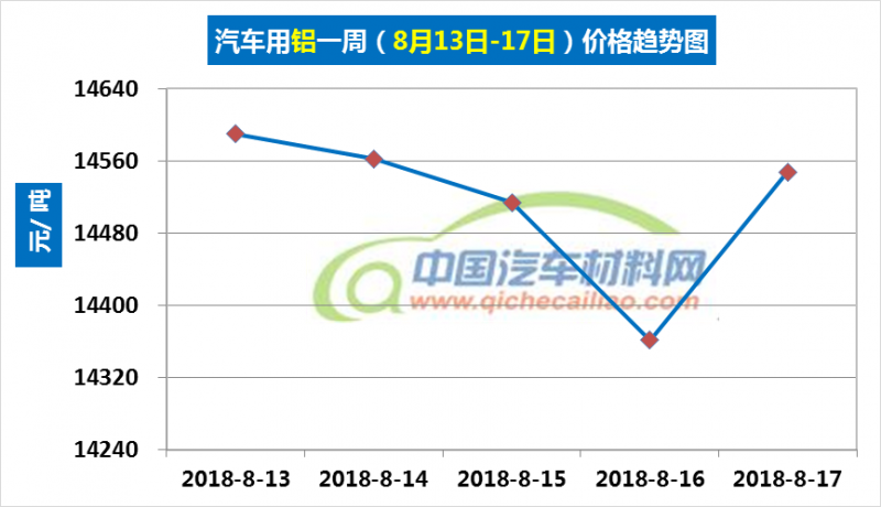汽车用铝本周内价格变化如下:8月13日-16日,价格下跌,跌幅为229元/吨;8月16-17日价格有所回升。汽车用铝本周均价为14515元/吨,较上周上涨0.30%,较7月份均价上涨2.87%。