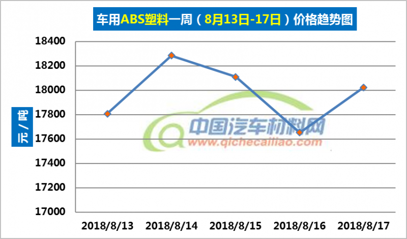 ABS塑料本周价格变化如下:8月13-14日,价格上涨,涨幅为467.73元/吨;8月14日-16日,价格下跌,跌幅为630.76元/吨;8月16-17日价格又有小幅回升。车用ABS塑料本周均价为17975.39元/吨,较上周上涨0.21%,较7月份均价上涨3.96%。