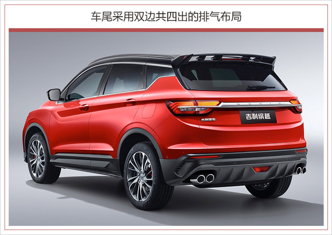 新车尾部造型饱满,并采用多组线条勾勒层次分明。横置式尾灯造型别致,内部加入多条LED灯带,视觉效果醒目。尾灯组之间辅以镀铬贯穿,且印刻有“GEELY”字样品牌徽标。此外,双边共两出的尾排布局配合底部扰流板设计,营造运动氛围。