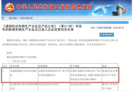 工信部8月17日官网公示的“《道路机动车辆生产企业及产品公告》(第311批)拟发布的新增车辆生产企业及已准入企业变更信息名单”中显示,奇瑞新能源汽车技术有限公司(以下简称奇瑞新能源)进入拟发布新增车辆生产企业清单。